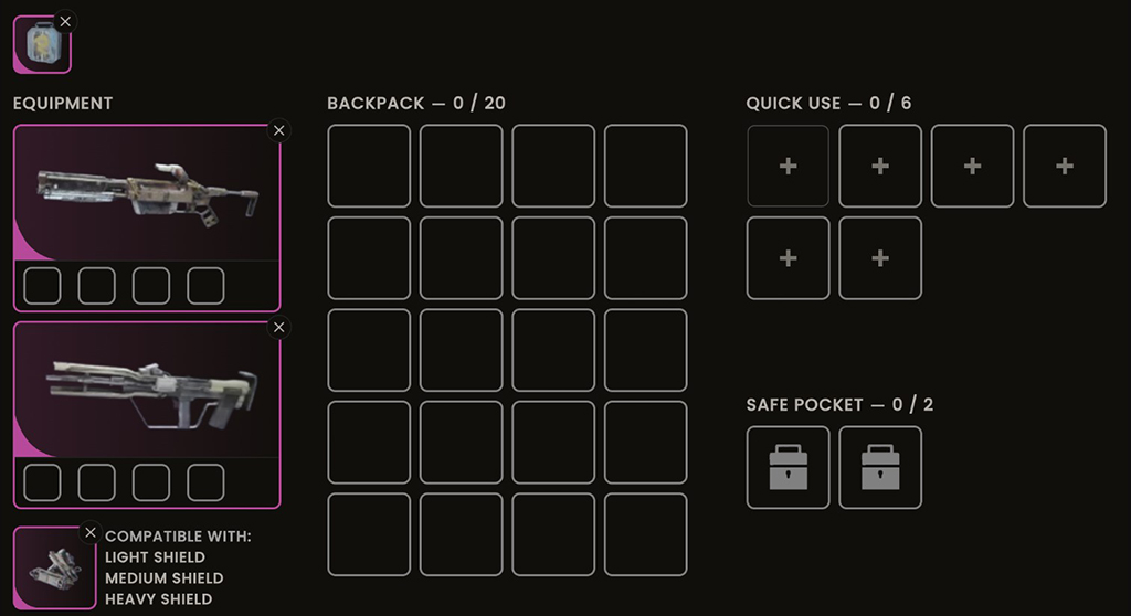 - Tactical Mark III – Provides 3 safe pocket slots (vital for storing Queen Reactors, Magnetic Accelerators, or blueprints). Also supports medium shields and more healing items.