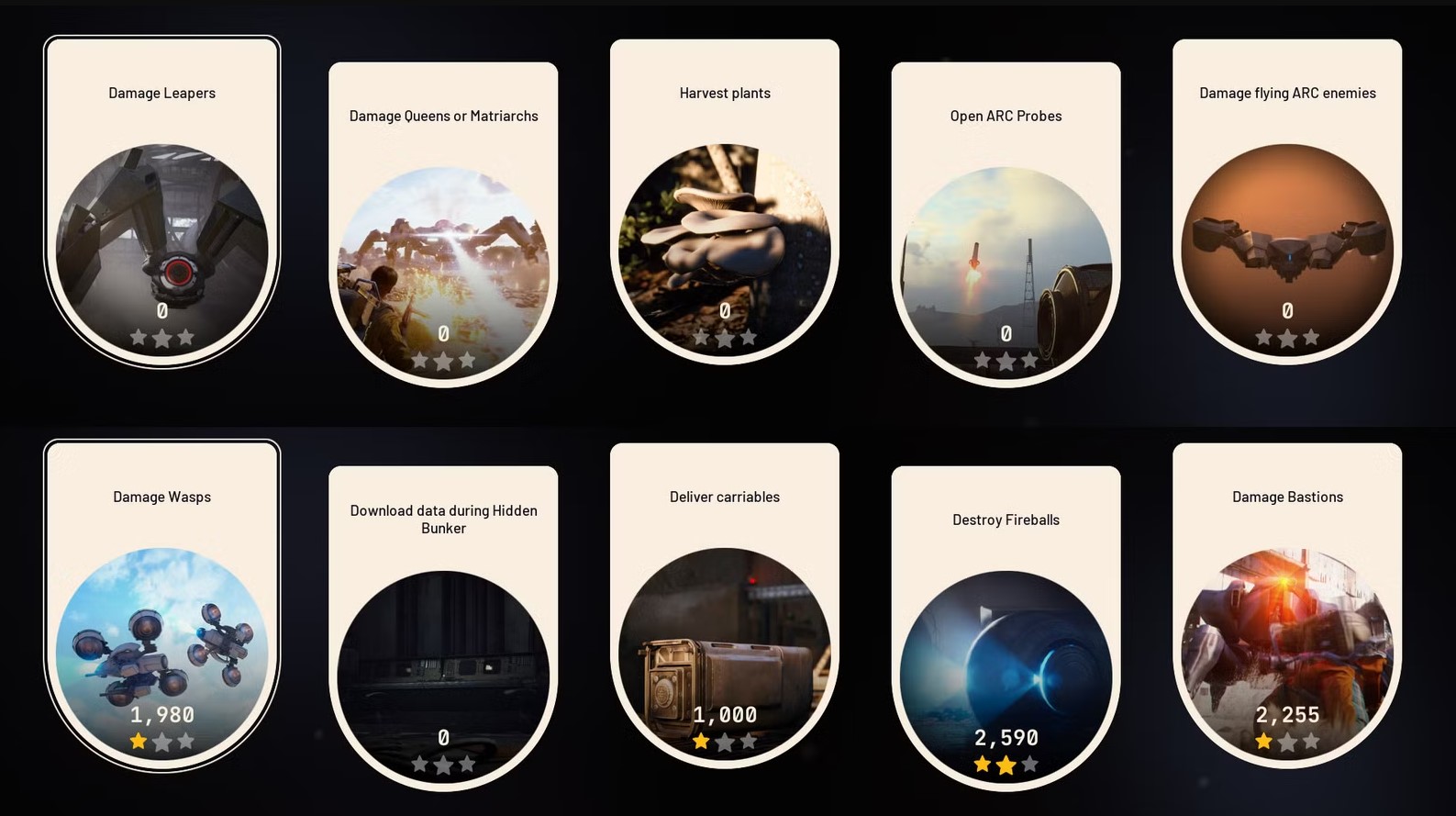 Each week, the 5 Trials objective will change. These objectives vary from damaging Queens & Matriarchs, to collecting plants & locate Prospecting Probes, etc. Here is a list with all the available objectives that can rotate during Trials and what points do they give: