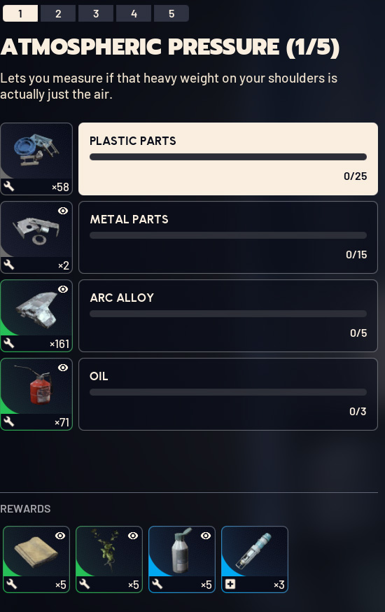 | 5 ARC Alloys | ARC Alloys are a primary piece of loot that you can get from defeating ARCs or by looting their Husks. |