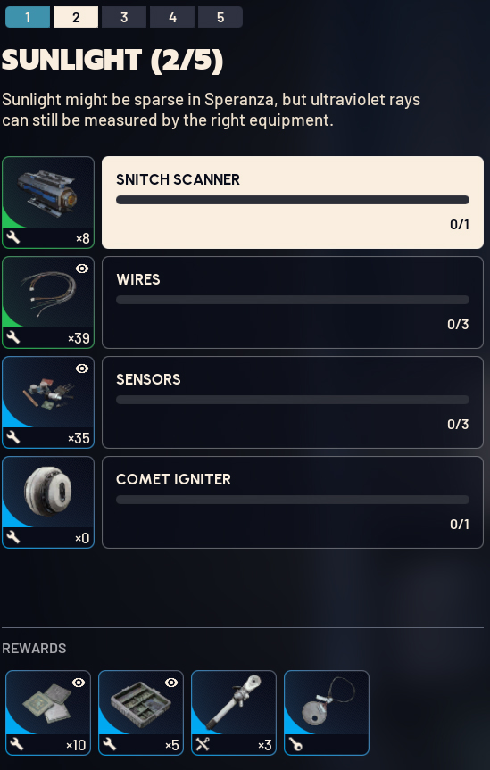- Stage II (Sunlight) - 10x Processors, 5x Advanced Electrical Components, 3x Ziplines, 1x Raider Hatch Key.