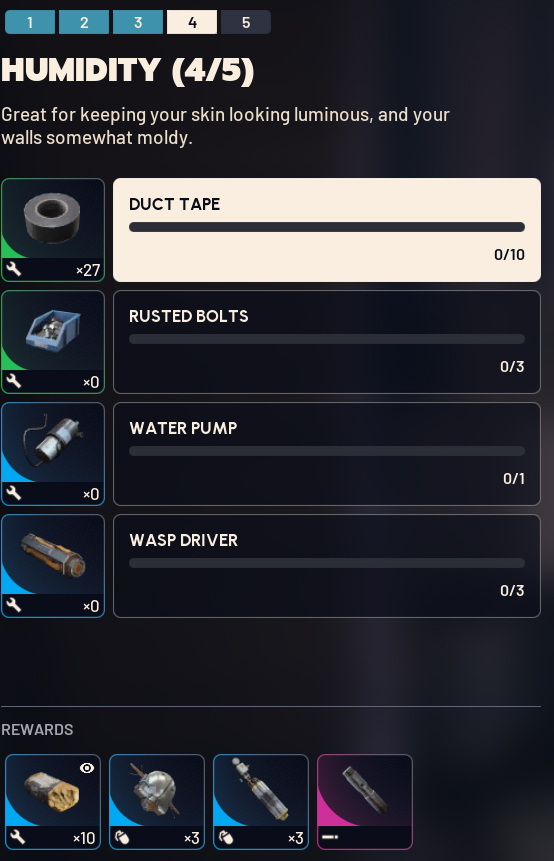 - Stage I (Atmospheric Pressure) - 5x Durable Cloths, 5x Great Mulleins, 5x Antiseptics, 5x Vita Shots.