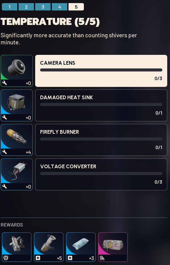 - Stage V (Temperature) - 1x Medium Shield, 5x Surge Shield Recharges, 3x Sterilized Bandages, 1x Tactical Mk.3 Revival.