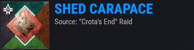 Shed Carapace - you can acquire this shader by completing all encounters in the "Crota's End" raid without dying and without leaving the activity.