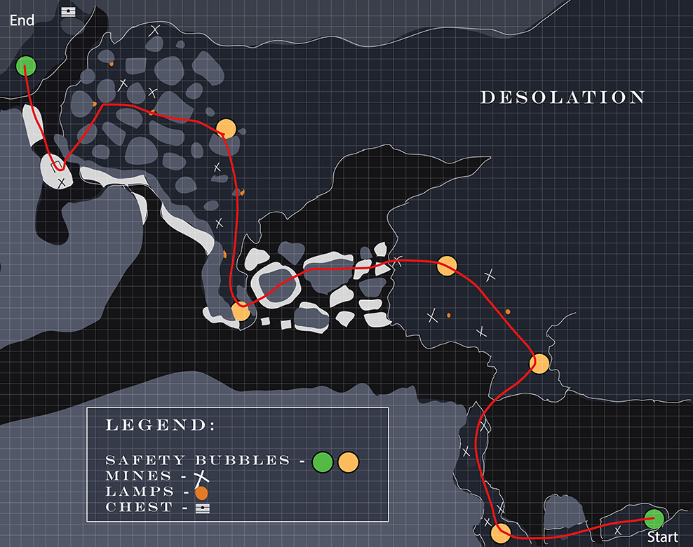 The first section is called Desolation and requires the players to use either their personal sparrow or the provided pikes to navigate a snow storm and move from bubble to bubble until they reach the first encounter. Here is a picture with the best route to take through the blizzard: