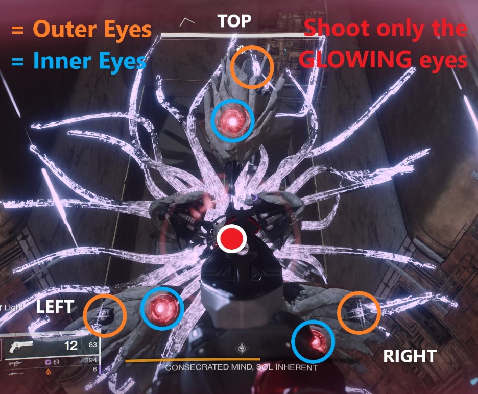 - Eye Killers follow the Consecrated Mind and have to collect the cube she drops in order to shoot her eyes. Your partner will need to call out which eyes you need to shoot. Check the picture below to understand the mechanic better:
