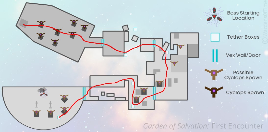 The encounter takes place in a long, open pathway with multiple relay nodes that must be activated in sequence. The team will move through different zones while fighting Vex waves and ensuring tethers are completed.
