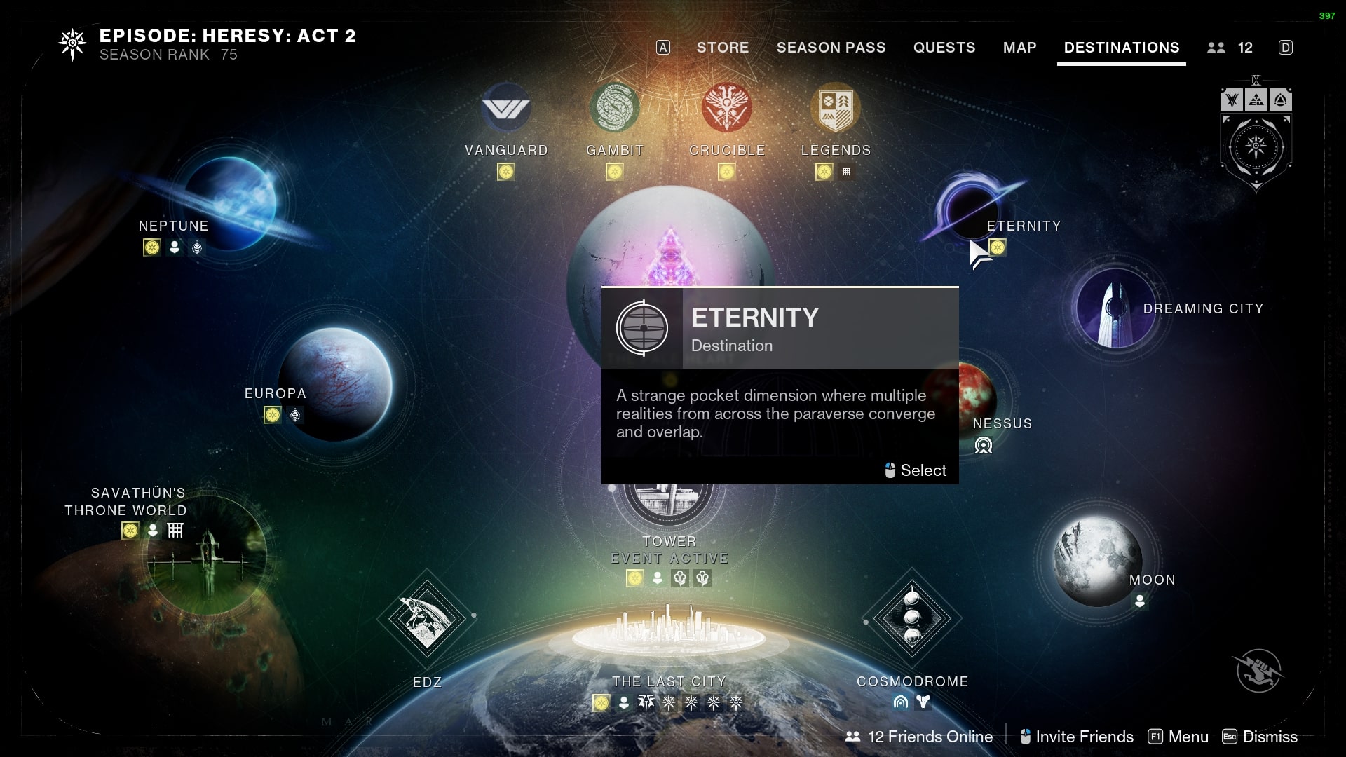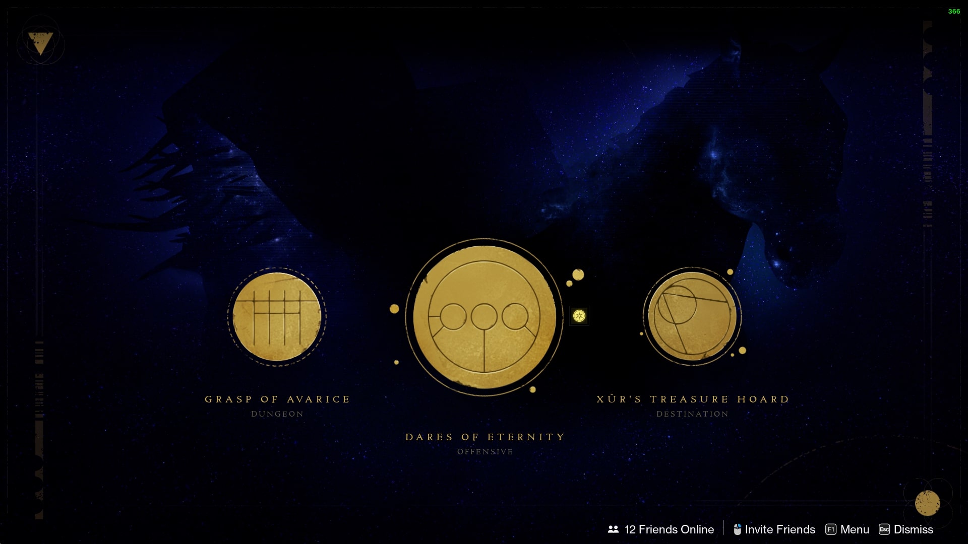 Once you’ve obtained the "And Out Fly the Wolves" quest, navigate to the Tower and visit Xur's Treasure Hoard, located in the Eternity destination.