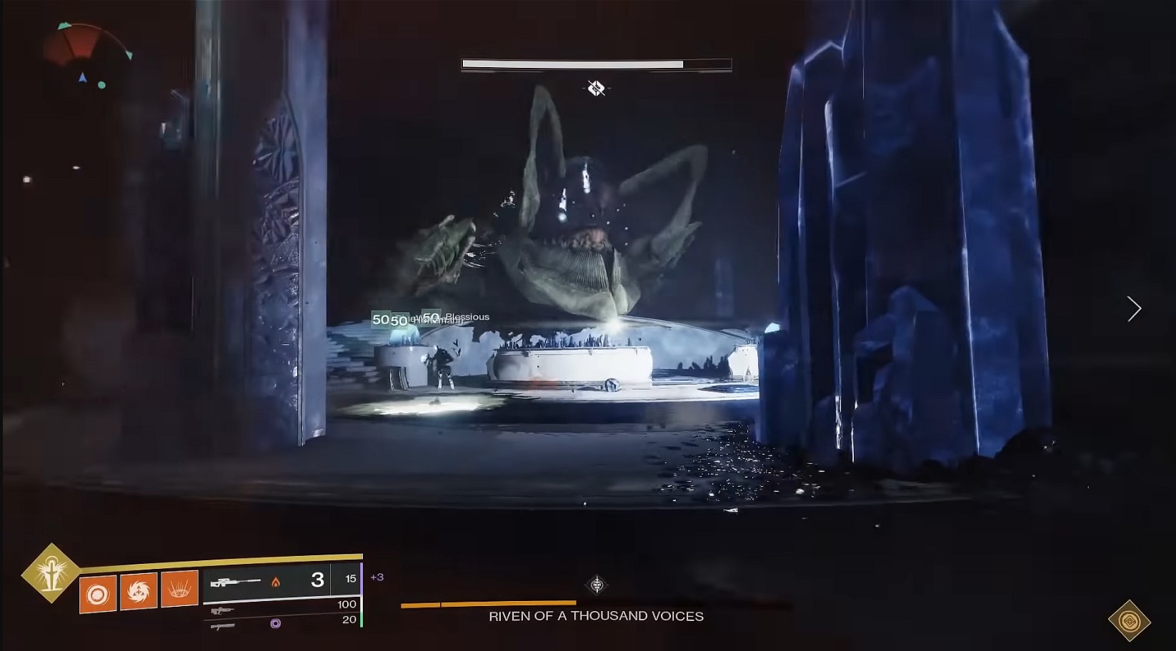 This is the main boss fight of the raid. Your fireteam splits into two teams and navigates mirrored paths through Riven’s inner chambers. Players must clear enemies, identify the correct eye to shoot during Riven’s appearance, and survive platforming challenges between phases.