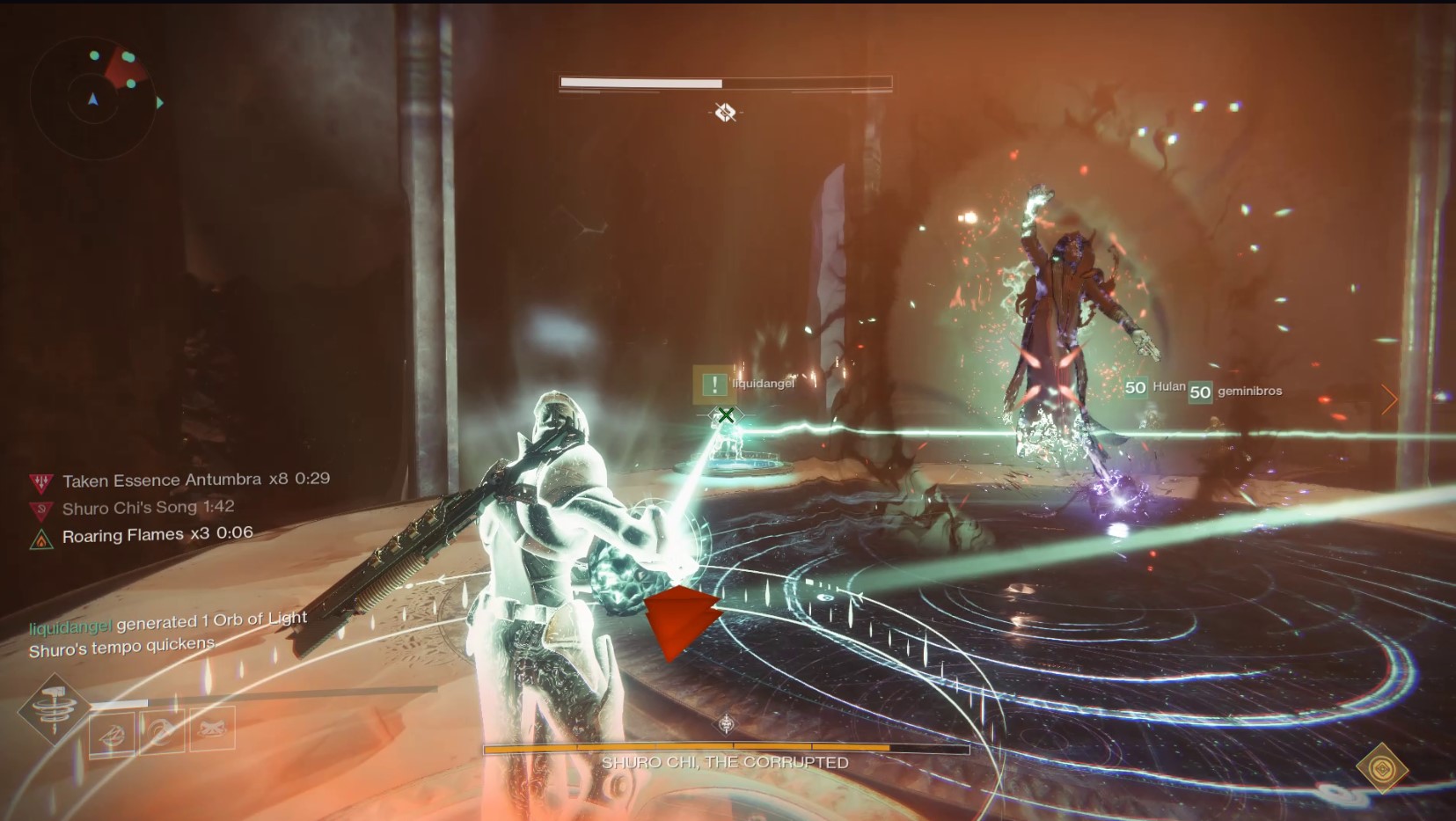 - DPS Team (entire fireteam): Groups up to burst Shuro Chi when the shield drops.