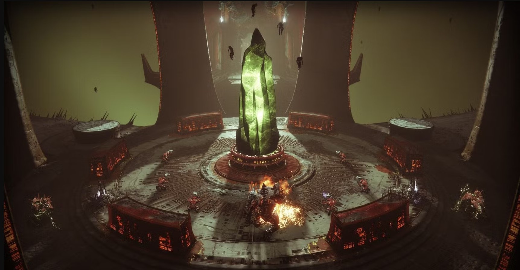 - The fight takes place in a long rectangular chamber with a large Hive totem at the center.