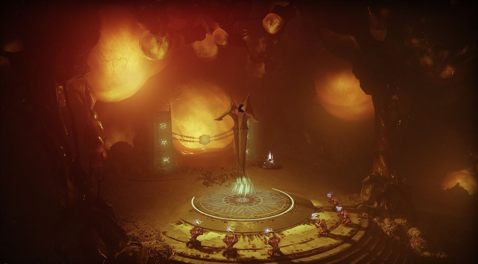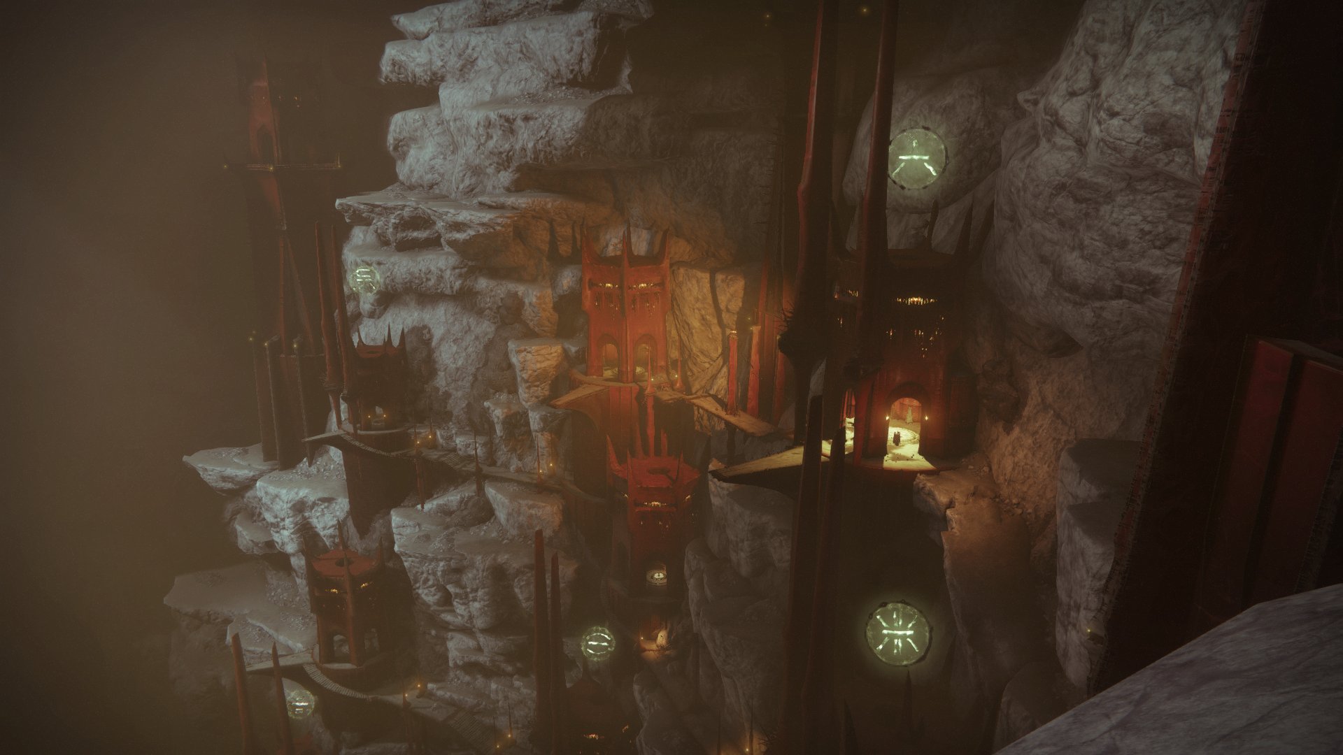 This encounter takes place in a large, open Hive canyon with multiple isolated towers spread across the map. Each tower has a rune on its front and houses a unique miniboss. A central tower displays 3 Hive runes; these indicate which towers must be cleared.