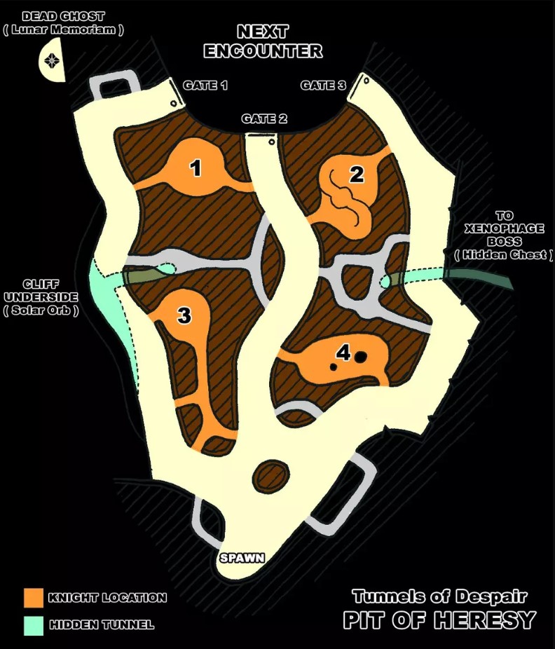 The encounter takes place in a dark, underground maze-like tunnel system. 3 blocked passageways are found throughout the tunnels, each must be destroyed with a Relic sword.