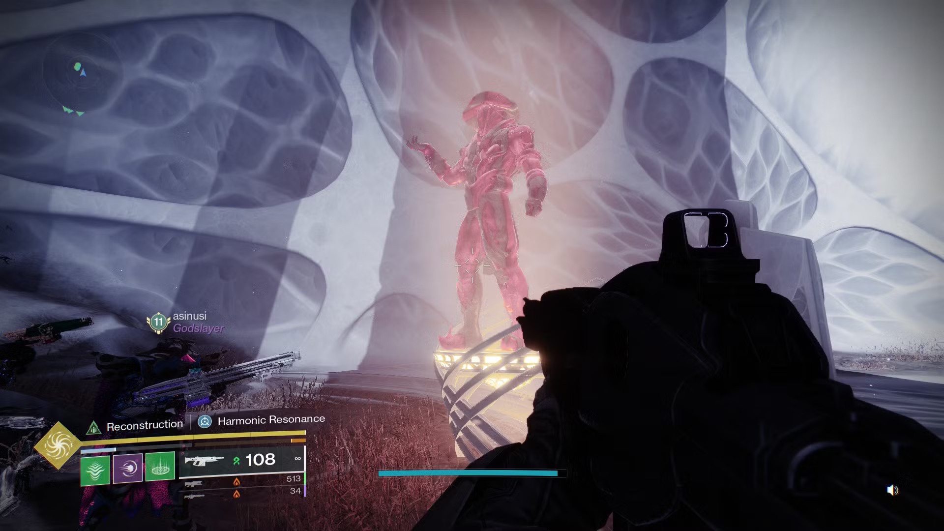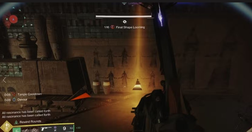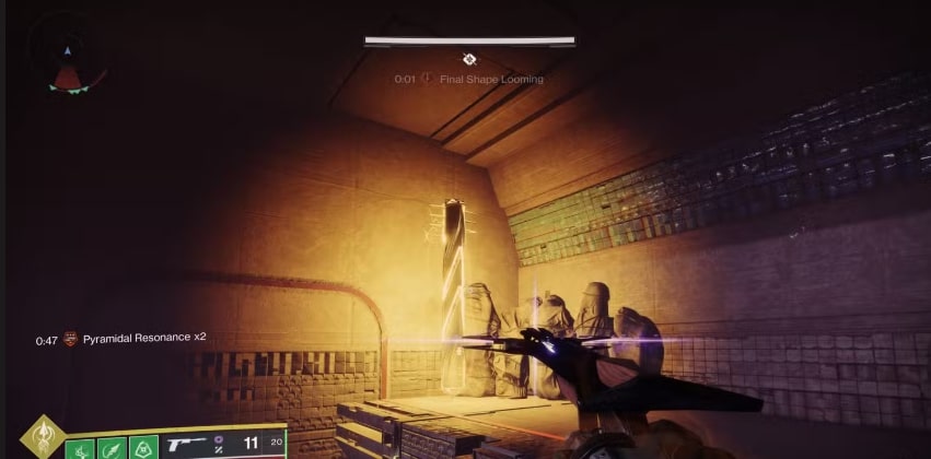 The first encounter introduces the Pyramidical (Triangle) Resonance, the primary goal is to run through the rooms, bounce the pulse to spawn resonances, collect resonances, close Totems, and deposit the resonances in the middle room.