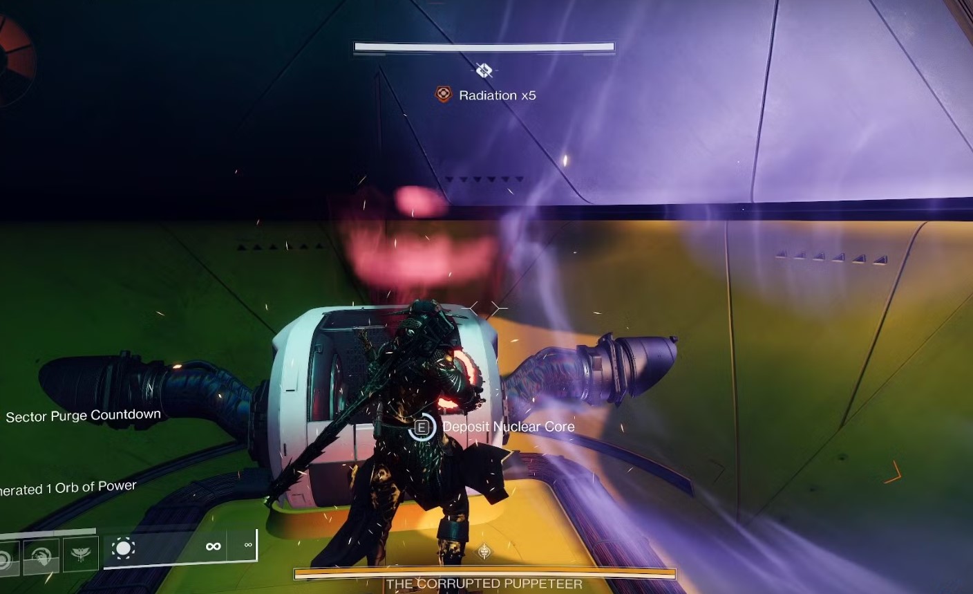 Once you start the encounter, there is a large sphere in the middle of the room, with 3 deposit boxes behind it. Your goal is to grab 3 Nuclear Cores from the 3 open rooms in the arena and dunk them in the 3 deposit boxes, one for each Nuclear Core.