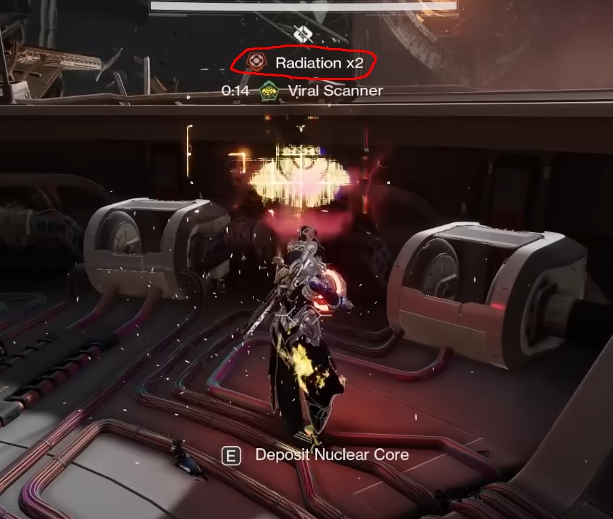 NOTE: Carrying a Nuclear Core will give you a debuff called Radiation. When this debuff reaches 10, it insta-kills you. You can either drop it on the ground and let your Radiation wear off, or get another player to pick it up from your hands.