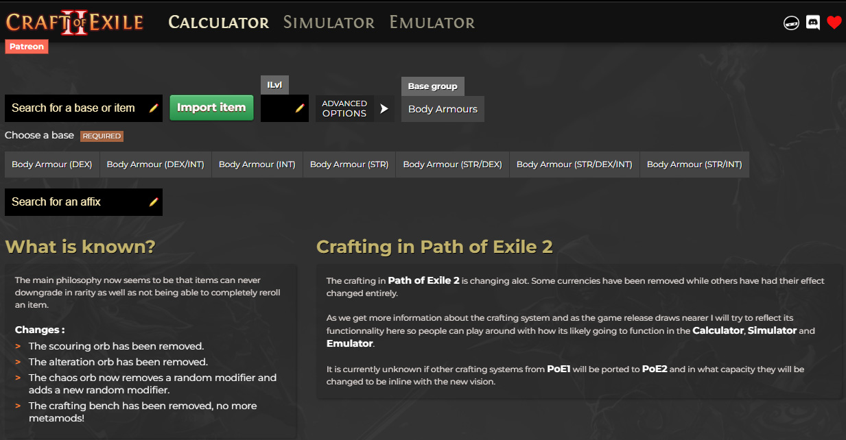 Craft of Exile is a compendium for anything crafting-related in Path of Exile 2. The website offers a variety of tools, from a crafting simulator and price calculator for various crafts to lists of modifiers with their weight for each item type. It’s essential to master this tool to increase your crafting knowledge, and they also provide accessible guides on each feature of their website.