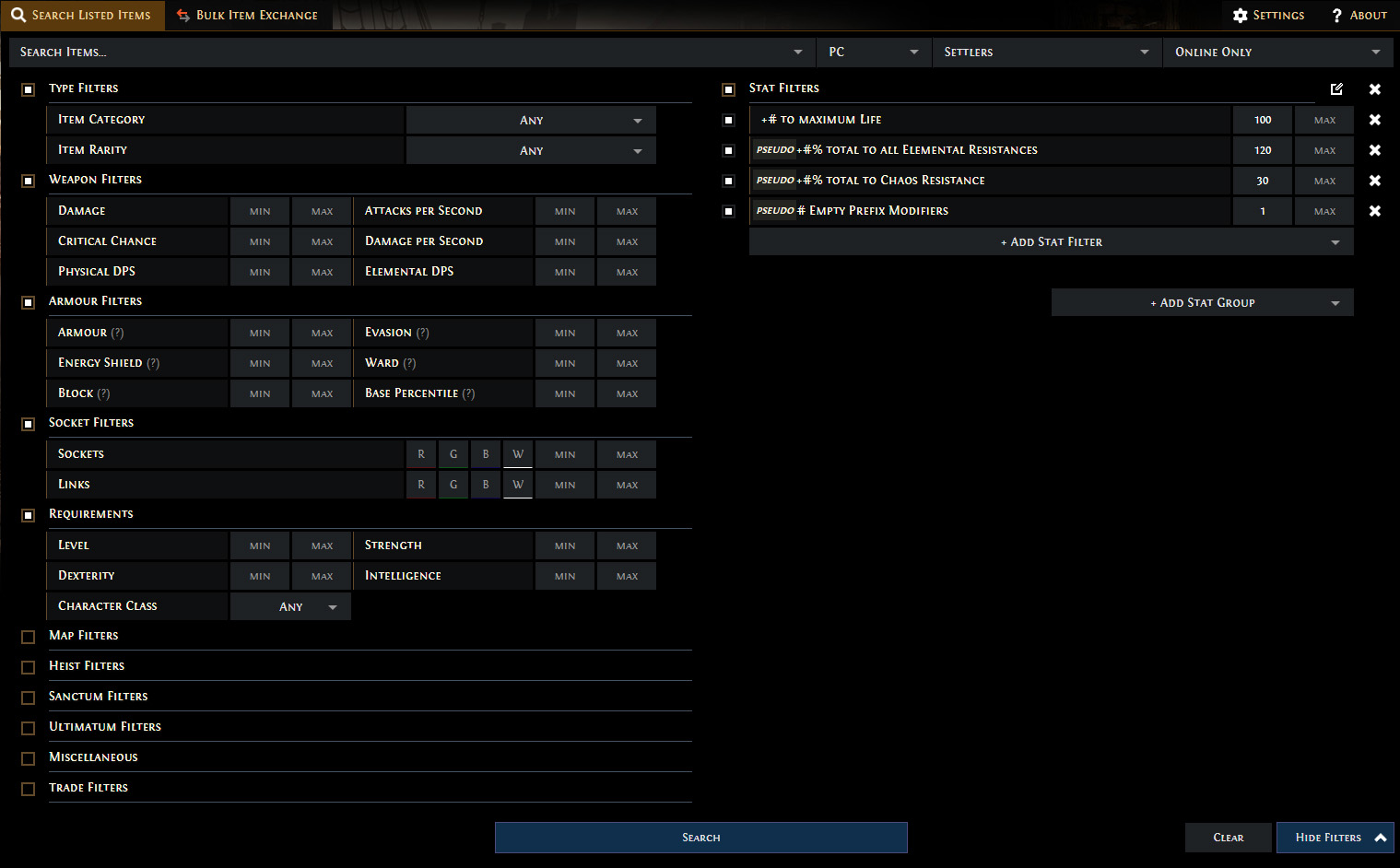 While Exilence is the master tool for pricing currency & consumables in bulk, it cannot price gear and uniques you own based on their stats. This is where Awakened PoE Trade comes in. This versatile tool allows you to check the price of any item on the go, working as an overlay. Additionally, it can help you create filters for sorting items in your stash tabs, or binding actions (like logout & exit) and text messages to a single key.
