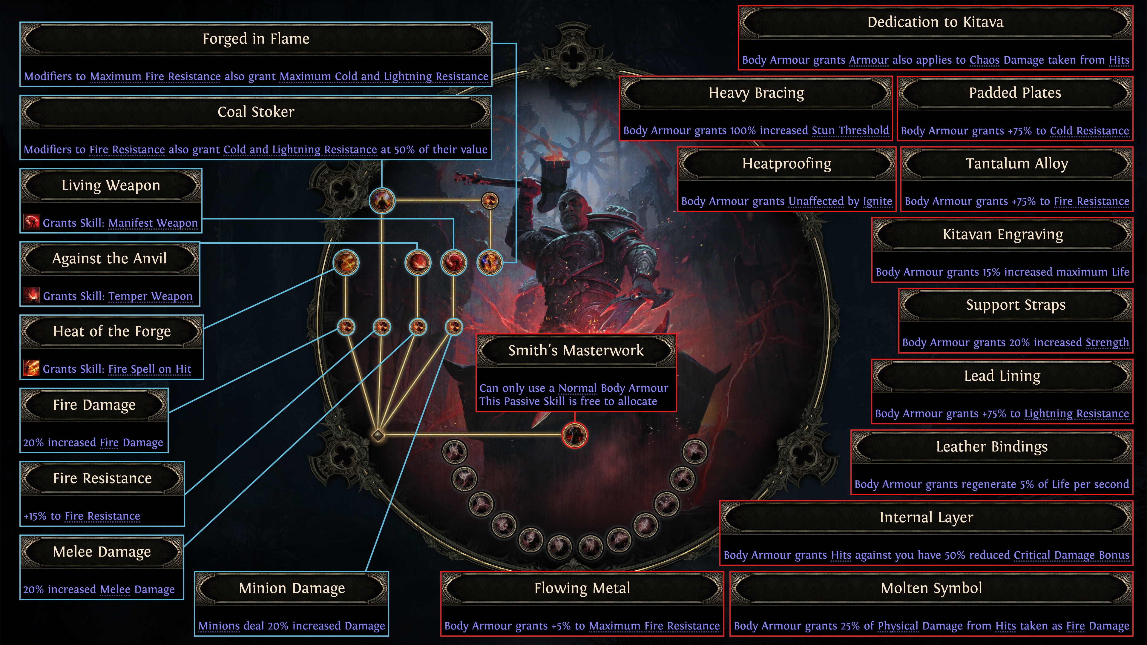 Smiths of Kitava are master blacksmiths that harness the power of fire, being able to temper their weapons, enhance them with fire, summon animated copies of their weapons to fight alongside them, and even forge armor to their liking, only being able to wear normal quality armor but gain powerful defensive stats through their ascendancy such as elemental resistances, max life, increased strength and more.
