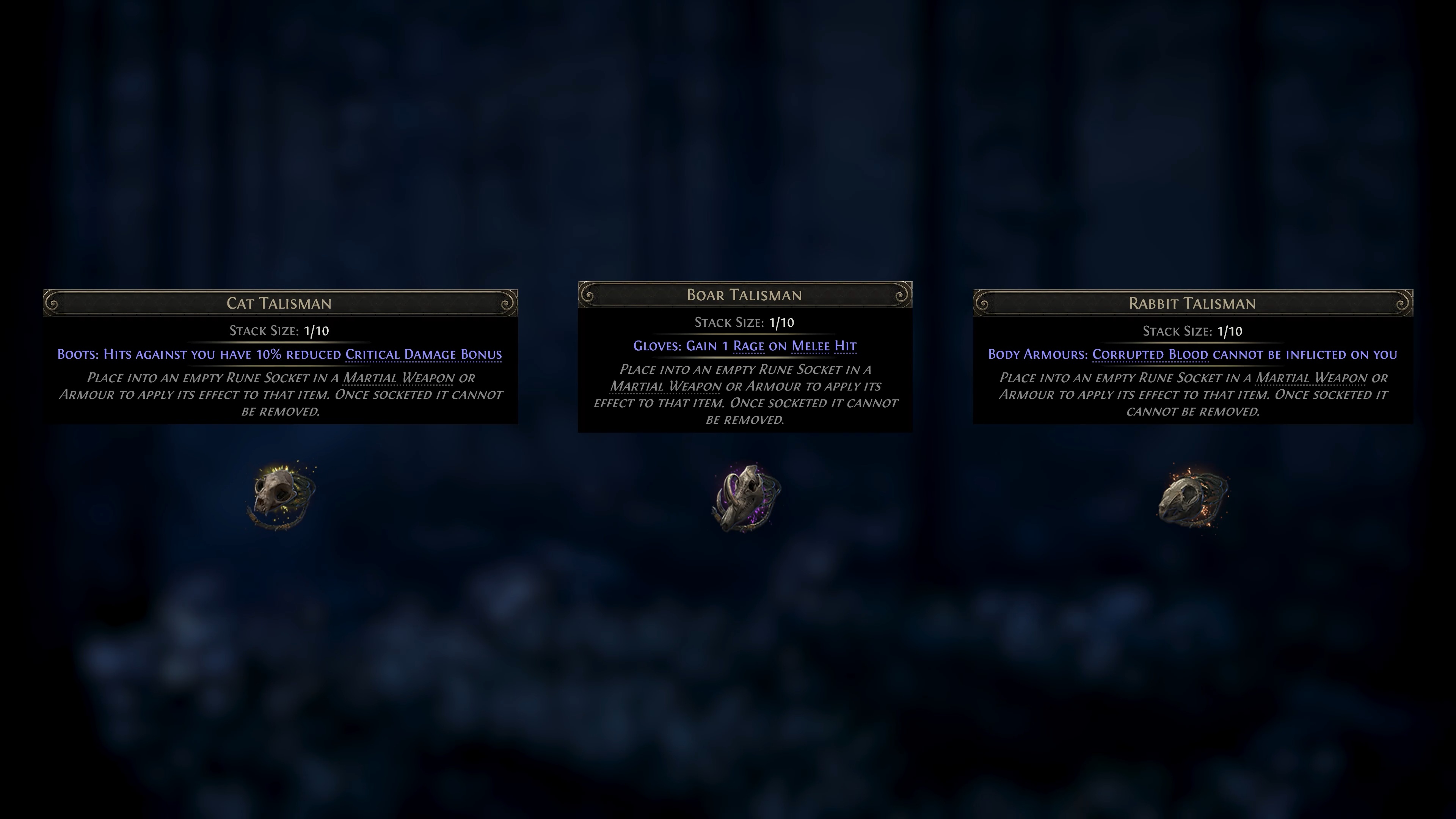 - Cat Talisman – Hits against you have 10% reduced Critical Damage Bonus