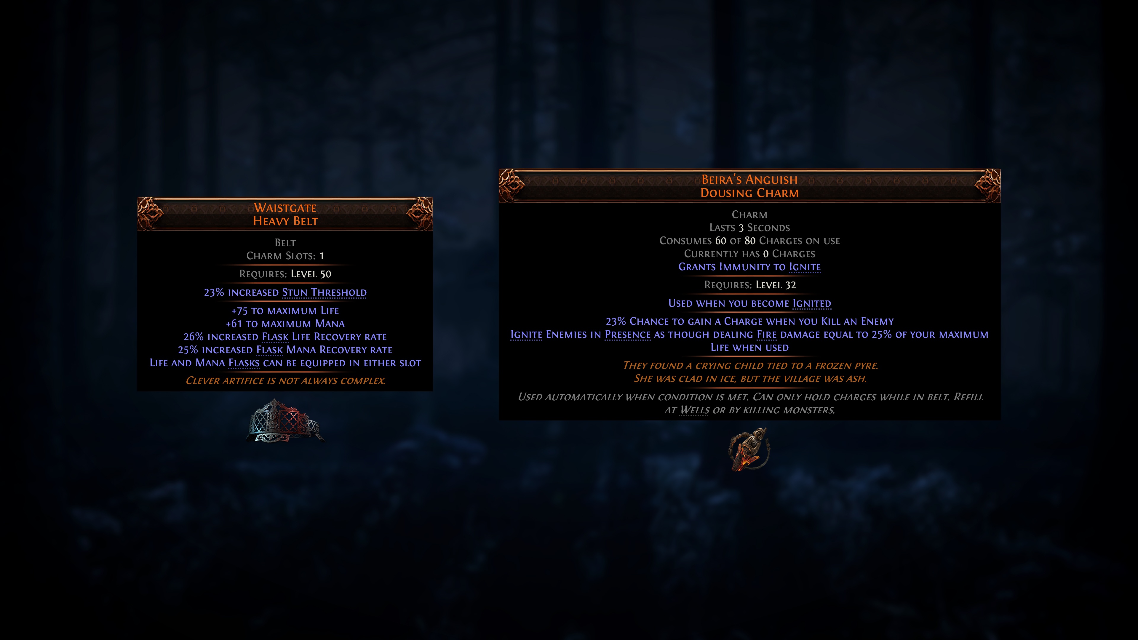 One of the more interesting charms is Beira’s Anguish, which revolves around creating a self-ignite health stacking build archetype, as the charm triggers when you get ignited, to then ignite nearby enemies as if dealing fire damage equal to 25% of your max life.