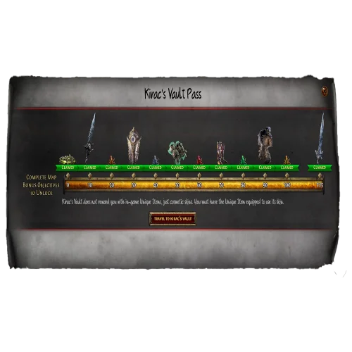 Kirac's Vault is Path of Exile's take on a Battle Pass. The rewards are earned through progressing the Atlas and are exclusive unique item skins. To claim the rewards, you must purchase Kirac's Pass and complete Atlas objectives to earn up to eight exclusive effects for your character.