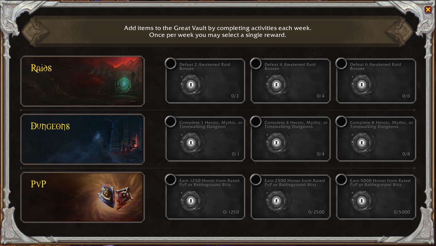 - Great Vault: You can obtain tier set items from all activities that typically reward Great Vault, such as raiding, Mythic+ dungeons, and PvP.